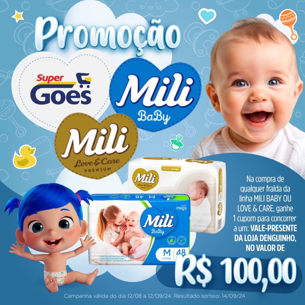 Na compra de qualquer fralda da linha MILI BABY OU LOVE&CARE, ganhe 1 cupom para concorrer a um: VALE-PRESENTE DA LOJA DENGUINHO, NO VALOR DE R$100,00